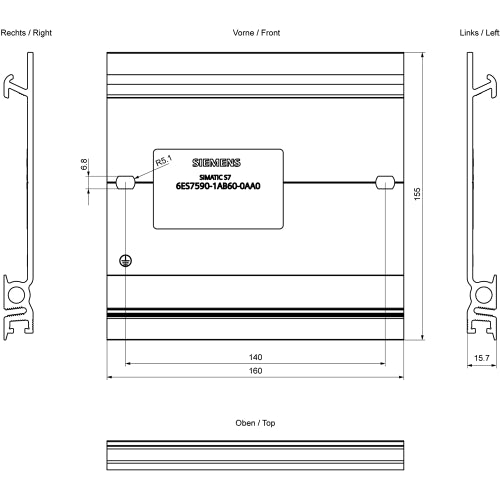 SIMATIC S7-1500, mounting rail 160 mm (approx. 6.3 inch); incl. grounding screw, integrated DIN rail for mounting of incidentals such as terminals, automatic circuit breakers and relays